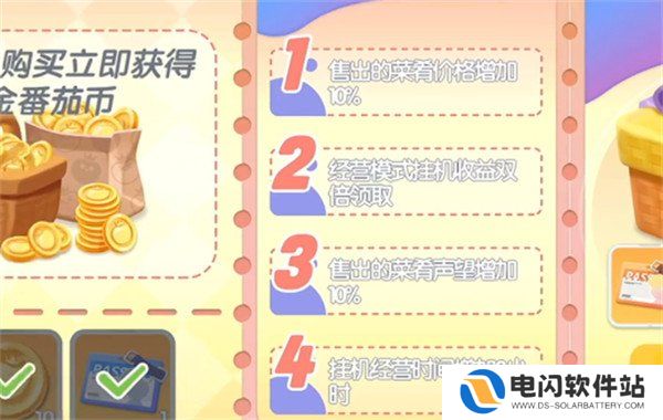 5、购买会员,可以给玩家带来双倍的离线收益,还有10%的收入。出售的菜肴价格也会逐渐的增加,另外整个经营模式的收益也可以获取双倍菜肴,在出售之后就能获得更多的声望。