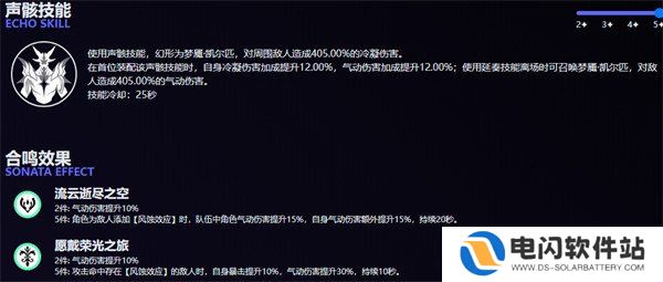 2、在首位装配该声骸技能时,自身冷凝伤害加成提升12.00%,气动伤害加成提升12.00%;使用延奏技能离场时可召唤梦魇·凯尔匹,对敌人造成405.00%的气动伤害。