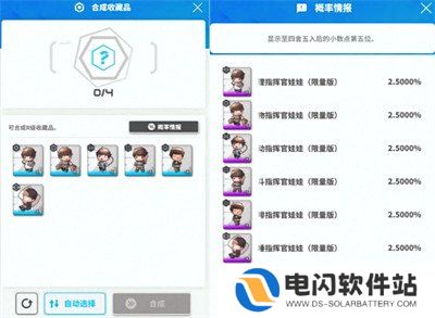 低级蓝色的收藏品,凑齐四个之后,就有2.5%的概率,可以合成限量版的紫色级别收藏品,同理,四个紫色级别的收藏品,也有一定的概率能够合成金色收藏品。