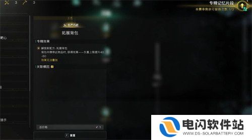 还有其他可考虑的专精,拓展背包能提升玩家负重上限,使玩家在探索时可携带更多物资返回基地,契合喜欢探索与采集的玩家需求,木石行囊能减轻背包中矿石、碎石、原木的重量,同样利于资源收集与运输,特制储物箱可制作64格储物空间的箱子,大幅增加玩家物资存储容量。