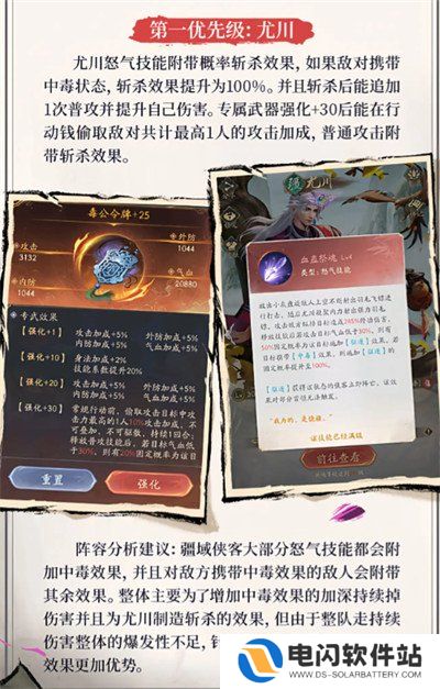 2、整体主要为了增加中毒效果的加深持续掉伤害并且为尤川制造斩杀的效果,但由于整队走持续伤害整体的爆发性不足,针对PVP的效果会比PVE的效果更加优势。