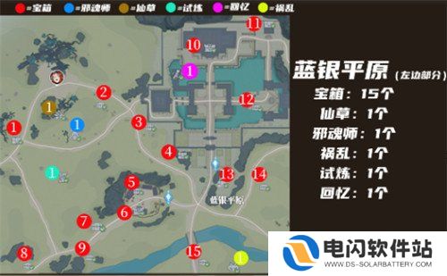 蓝银平原左边部分玩家就能找到15个宝箱,数量还是比较多的。无论是在草地上还是在古老的遗迹,旁边都有机会找到宝箱。玩家在将宝箱打开之后就可以得到一些仙品药草,可以有效提升魂力,甚至还有可能会得到魂技残卷。