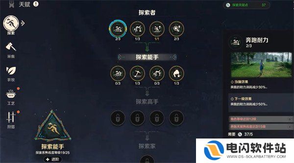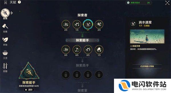 前期探索天赋不足时,在第一排各项探索天赋中,优先考虑解锁能减少体力消耗类的天赋,例如奔跑耐力、翻滚跳跃耐力,它们可让玩家的探图体验变得更好。要是自身在探索时需要频繁地穿越河流,可先把淌水速度点了,再去考虑其它。此外,前面这三个天赋最好都点满,而扫描能力按需来点,增加扫描范围的效果优先级没有其它三个那么高。