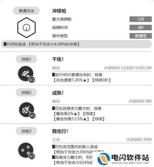 索林在战斗的过程中还会展现出强大的实力,冲锋枪射击是普通的攻击。在每一次攻击之后,都会给目标造成4.68%的伤害。干练是被动技能,在经过40次的普通攻击之后就可以提升自身的攻击速度。成熟是另外一个被动技能,当自身体力处于最大的状态时,就可以提升暴击伤害,还有自身的暴击。我也行是主动技能,有40秒的冷却时间,可以给范围内的敌人全部都造成伤害。