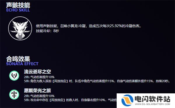 2、5件:攻击命中存在【风蚀效应】的敌人时,自身暴击提升10%,气动伤害提升30%,持续10秒。