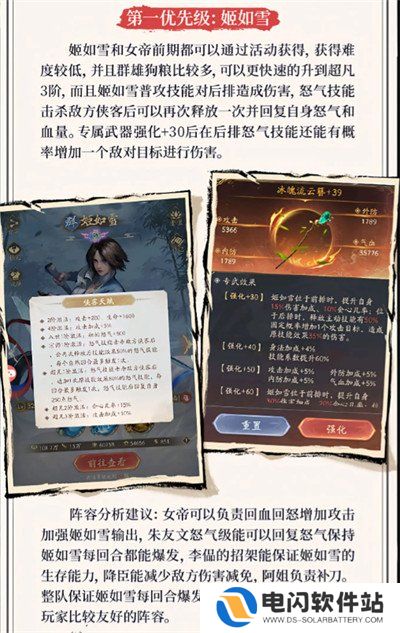 1、女帝可以负责回血回怒增加攻击加强姬如雪输出,朱友文怒气级能可以回复怒气保持姬如雪每回合都能爆发,李保的招架能保证姬如雪的生存能力,降臣能减少敌方伤害减免,阿姐负责补刀。