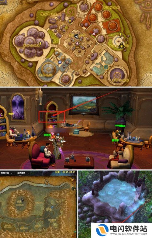 1、我们来到破碎群岛达拉然的魔术旅馆,坐标(48.90, 41.73)和里面的书架的第一张纸互动。