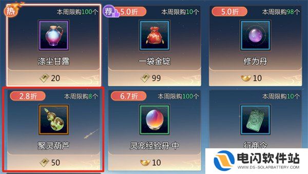 1、可以在屏幕正上方【商城】中的每周特惠处使用【印天宝券】购买聚灵葫芦,每周限购10个。