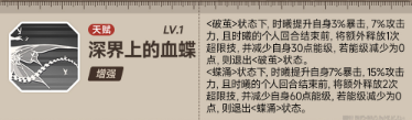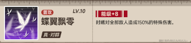 <蝶涌>状态下,时曦提升自身10%暴击,20%攻击力,且时曦的个人回合结束前,将额外释放2次超限技,并减少自身60点能级,若能级减少为0点,则退出<蝶涌>状态。