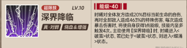 时曦对全体友方造成20%目标当前生命的自伤,再对全部敌人造成463%的特殊伤害,每次造成暴击伤害时,将使自身获得1点能级,技能内至多触发4次。主动使用【深界降临】时,时曦进入>破茧>状态,若已处于>破茧>状态,则进入>蝶涌>状态。