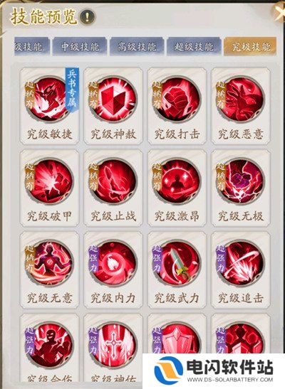 技能词条:武力(外功加成)、英勇(爆发强化)、无极(单体增伤)