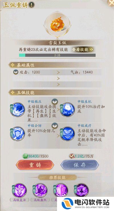 重铸:雪梨品质以上玉佩重铸23次必出稀有技能,建议锁定「内力」「会伤」等核心属性后重铸