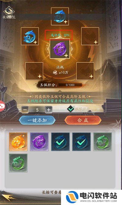 合成:5个同等级玉佩合成成功率100%,优先保留带「追击」「会伤」等核心词条的玉佩