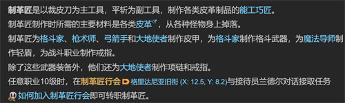 制革匠在游戏中是一个能够制作各种皮革用品的工匠,成为制革匠后可以给枪术师、格斗家、大地使者以及弓箭手等职业制作各种皮革,想要成为制革匠的话,玩家等级首先要提升到10级,然后千瓦给格利达尼亚旧街的制革匠行会找到兰德尔对话,完成制革匠任务,才能成为制革匠。