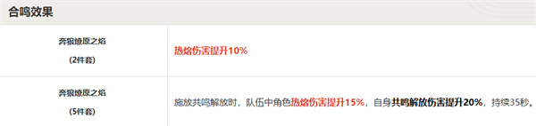 5件:施放共鸣解放时,队伍中角色热熔伤害提升15%,自身共鸣解放伤害提升20%,持续35秒。
