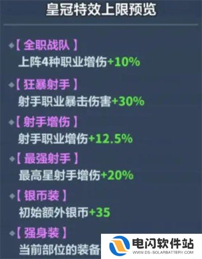 皇冠可洗炼出射手职业的专属特效,可优先选择【射手增益类】特效。其它装备特效推荐【银币装】,加快前期阵容的组成速度。